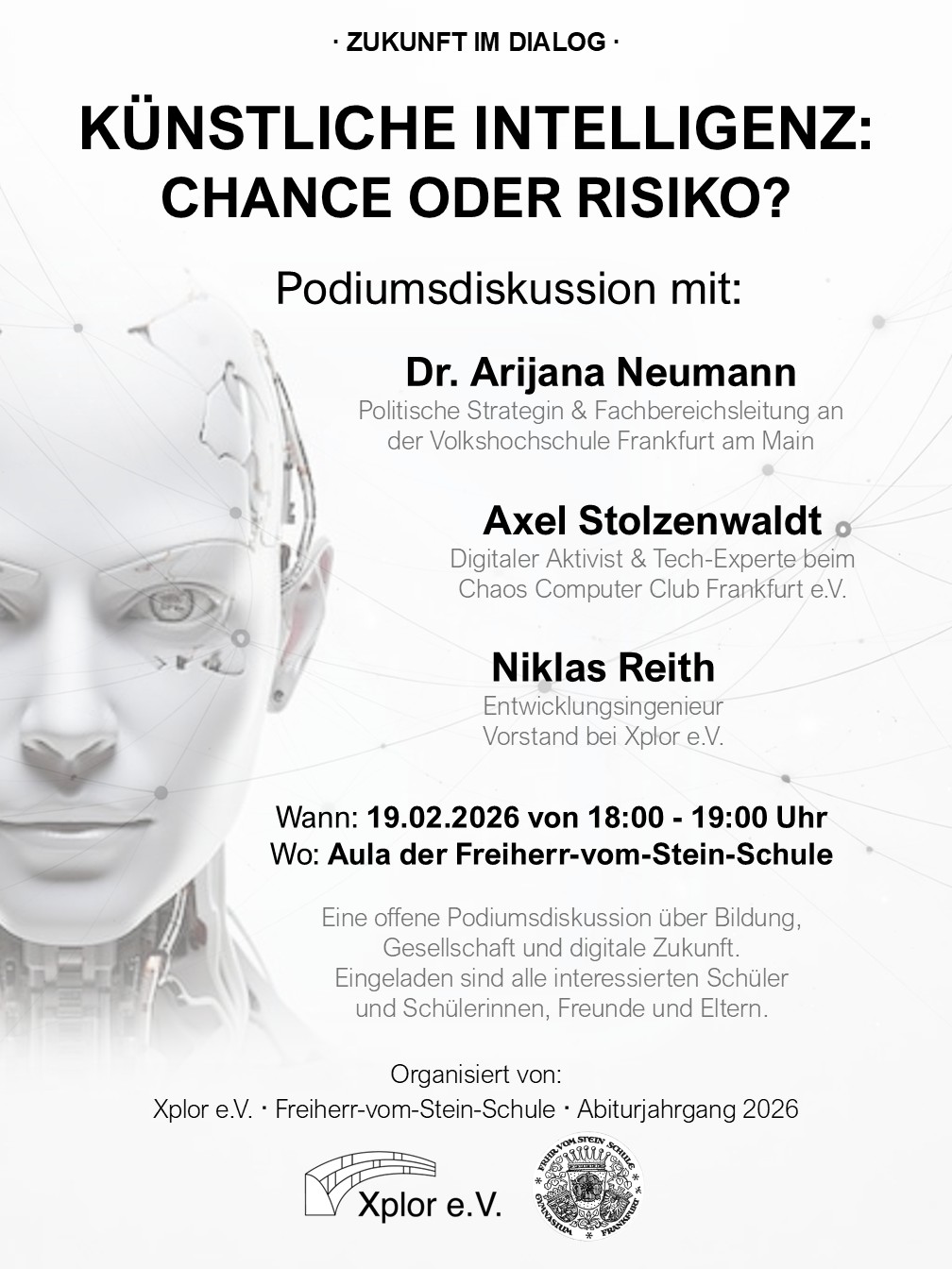 Am 19. Februar 2026 haben im Rahmen unserer Podiumsdiskussionsreihe „Zukunft im Dialog“ in der Freiherr-vom-Stein-Schule diskutiert, gefragt und hinterfragt. Thema des Abends war „Künstliche Intelligenz: Chance oder Risiko?“. Die Veranstaltung war Teil unserer Reihe „Zukunft im Dialog“, mit der wir den Austausch zwischen Expertinnen und Experten verschiedener Fachrichtungen und Schülerinnen und Schülern zu aktuellen gesellschaftlichen Themen fördern möchten.