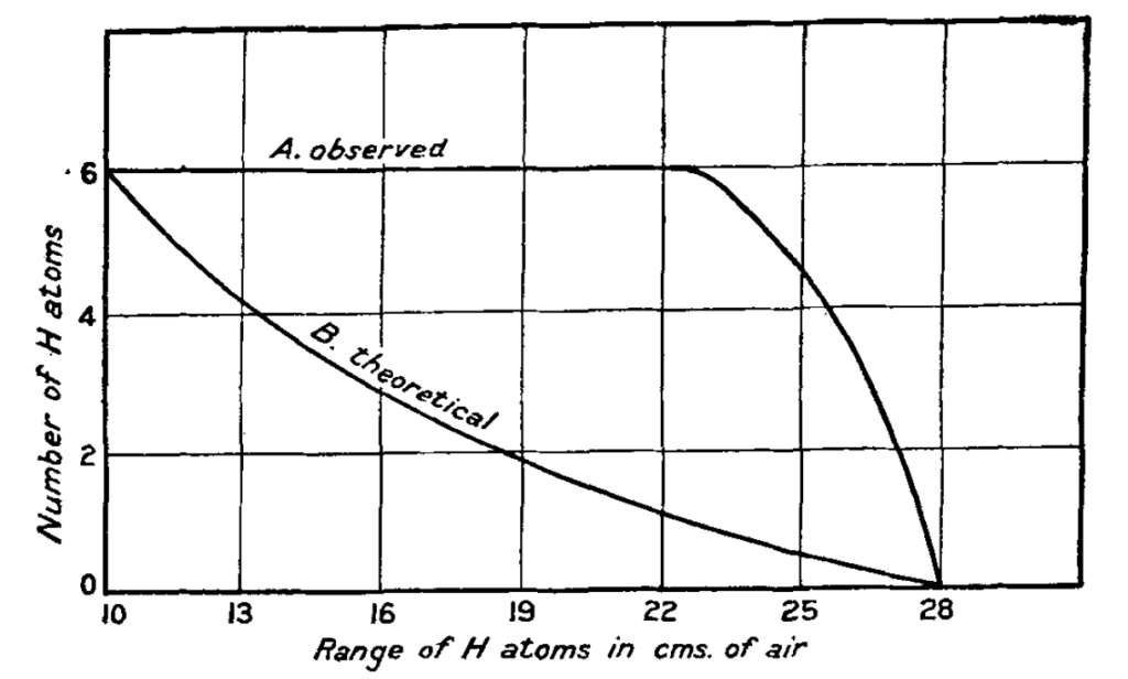 Im ersten Teil seines Experiments (Rutherford 1919a) beobachtete Rutherford nun, was passiert, wenn er das Gehäuse mit Wasserstoffgas füllt. Zu seinem Erstaunen nahm die Anzahl der beobachteten Wasserstoffkerne nicht wie erwartet mit dem Abstand zum Zinksulfid-Schirm kontinuierlich ab. Stattdessen beobachtete er eine nahezu konstante Anzahl an Szintillationen, die erst ab einer kritischen Distanz plötzlich und schnell abflauten. Dieser Verlauf war jedoch nur dann zu beobachten, wenn die Alphastrahlung hinreichend energiereich war. Je schwächer das Energieniveau der Alphastrahlung desto eher entsprach der Verlauf dem von der Punktladungstheorie vorhergesagten Verlauf.