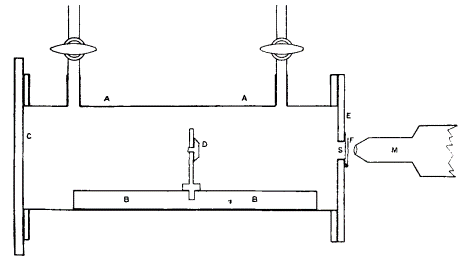 Abbildung1: Rutherfords Versuchsaufbau, A = Messinggehäuse (18x6x2 cm), B = Metallbalken mit Abstandseinstellung, C = Glasplatte, D = radioaktive Scheibe (Radium), E = gewachste Messingplatte, F = Zinksulfid-Schirm, M = Mikroskop, S = rechteckige Öffnung (10×3 mm) mit Metalleinlage (v.a. Silber) (Rutherford 1919a, S. 543ff.)