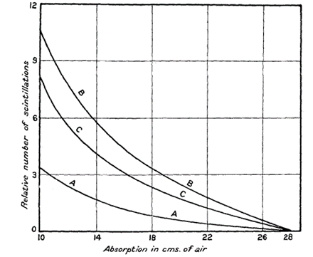 Abbildung 3 Wasserstoff-Szintillationen nach Beschuss von Alphastrahlung in verschiedenen Medien, A = Kohlenstoffdioxid, B = Luft, C = Stickstoff-Effekt (Rutherford 1919d)