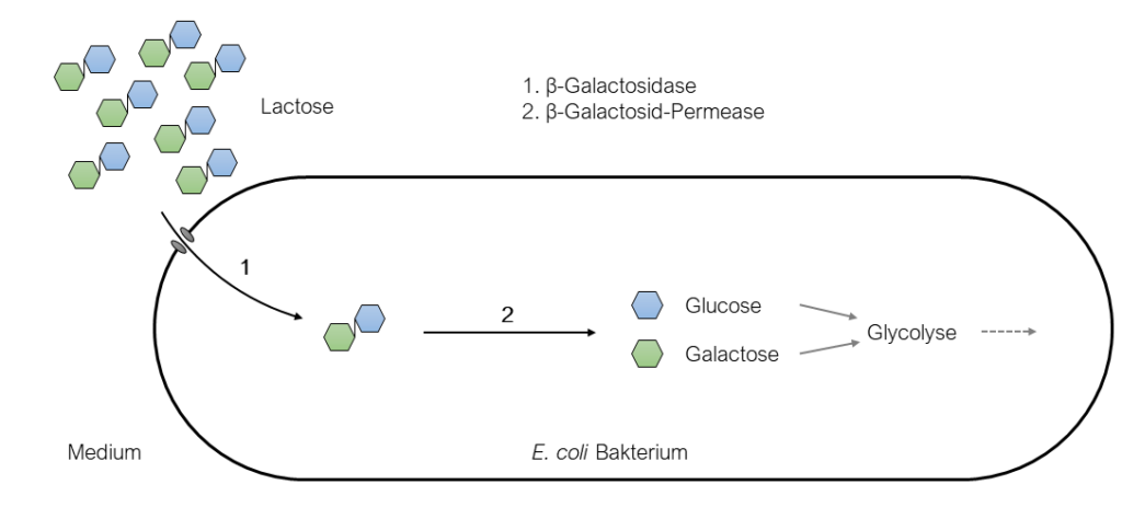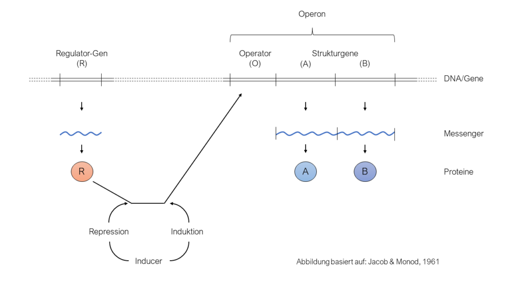 Wir befinden uns im Jahre 1960. Wenige Jahre zuvor wurde die DNA als Träger der genetischen Erbinformation entdeckt (1944 – Oswald T. Avery), die Struktur dieser durch James Watson und Francis Crick mit unerlässlicher Hilfe von Rosalind Franklin und Maurice Willkins gelöst (1953) und deren Art der Replikation durch Matthew Meselson und Franklin Stahl entdeckt (1958). Die Molekularbiologie steht nun nicht mehr in den Kinderschuhen, sondern wächst rasant mit einer immer größeren Anzahl an WissenschaftlerInnen auf der ganzen Welt, welche sich mit Fragen rund um die biologische Rolle der DNA und ihre Verbindung zum Leben beschäftigen. So wurde allgemein angenommen, dass einzelne Abschnitte der DNA die Information für den Aufbau und die Zusammensetzung von bestimmten Proteinen beinhalten. Diese Abschnitte werden auch als Gene definiert und das Speichern von Information als Codieren bezeichnet (Gamow, 1954; Watson, 1963; Crick, 1964). Als Verbindungsstück zwischen der DNA als statischer Informationsspeicher und den agilen Proteinen wurde ein weiteres Molekül, die Messenger-Ribonukleinsäure (mRNA) angenommen. Viele Arbeitsgruppen arbeiteten zu dieser Zeit an Bakterien, da sie im Vergleich zu Pflanzen oder Tieren für die Molekularbiologie leichter zu handhaben sind. Eines der in den Laboren am weitesten verbreiteten Bakterien war und ist immer noch das Bakterium Escherichia coli (E. coli). Um es zu vermehren und eine ausreichende Menge an Biomasse (Menge an organischem Material, z.B. ein gewisses Gewicht an Bakterien) zu produzieren, braucht man es lediglich in ein mit flüssigem Nährmedium (eine Flüssigkeit, welche alle Nähstoffe für das Wachstum von Bakterien beinhaltet) gefüllten Behälter zu geben und zu warten. Das exponentielle Wachstum des Bakteriums lässt sich bereits nach einigen Stunden durch die Trübung des Mediums beobachten. Unter optimalen Bedingungen verdoppelt sich die Anzahl an E. coli Bakterien alle 20 min. Optimal ist eine Temperatur von 37°C und eine ausreichende Versorgung mit Nährstoffen. Bei Zweiterem spielt die Quelle an Kohlenhydraten (=Zucker) eine entscheidende Rolle, so nehmen sie bevorzugt Glucose auf, können aber auch andere Zucker zersetzen und daraus Energie gewinnen. Ein Beispiel: Befinden sich in dem Nährmedium sowohl Glucose (ein Einfachzucker bzw. „Monosacharid“) als auch Lactose (einem Zweifachzucker bzw. „Disacharid“, welches aus den Monosacchariden Glucose und Galactose aufgebaut ist) als Zucker-Quelle, nimmt ein E. coli Bakterium bevorzugt die Glucose auf. Erst wenn diese verbraucht ist, bedient es sich an der Lactose. Ähnlich wie wir Menschen hat auch das Bakterium eine Art „Lieblingsessen“ und greift erst zu einer Alternative, wenn dessen Leibspeise nicht zur Verfügung steht. Um Glucose abzubauen und Energie zu gewinnen, werden bestimmte Enzyme benötigt. Der Abbau von Lactose hingegen erfordert zusätzliche Enzyme, welche das Disaccharid in seine Bestandteile (die Monosacchariden Glucose und Galactose) spalten, welche von da an, denselben Prozess zur Energiegewinnung durchlaufen. Es würde sich demnach für das Bakterium energetisch betrachtet lohnen, wenn es die zusätzlichen Enzyme zum Abbau der Lactose erst synthetisieren (=herstellen) muss, wenn diese auch benötigt werden. Sind die Bakterien nun gezwungen von Glucose auf Lactose als Zucker umzusteigen, müssen jedoch die zusätzlichen Enzyme synthetisiert werden, welche die Energiegewinnung auf den Abbau von Lactose ausrichten. Ein solcher Vorgang wurde von WissenschaftlerInnen häufig beobachtet und man gab diesem Phänomen die Bezeichnung „Enzymadaptation“. Die Theorie der Enzymadaptation geht im Allgemeinen davon aus, dass sich die Anzahl der in einer Zelle befindlichen Enzyme in Abhängigkeit eines Umweltreizes verändern kann (Duclaux 1898, Dienert, 1900). An dem Glucose/Lactose-Beispiel von vorhin würde es bedeuten: Befindet sich Glucose im Medium, kommen die Enzyme zum Abbau von Glucose häufig in der Zelle vor und die für den Abbau von Lactose in sehr geringen Mengen. Ist aber nur Lactose im Medium vorhanden, erhöht sich die Menge an den zusätzlich benötigten Enzymen für den Abbau von Lactose. Die Lactose induziert also in diesem System ihren eigenen Abbau und wird deswegen hier auch als „Inducer“ bezeichnet.