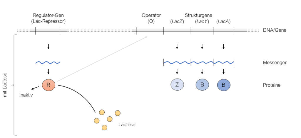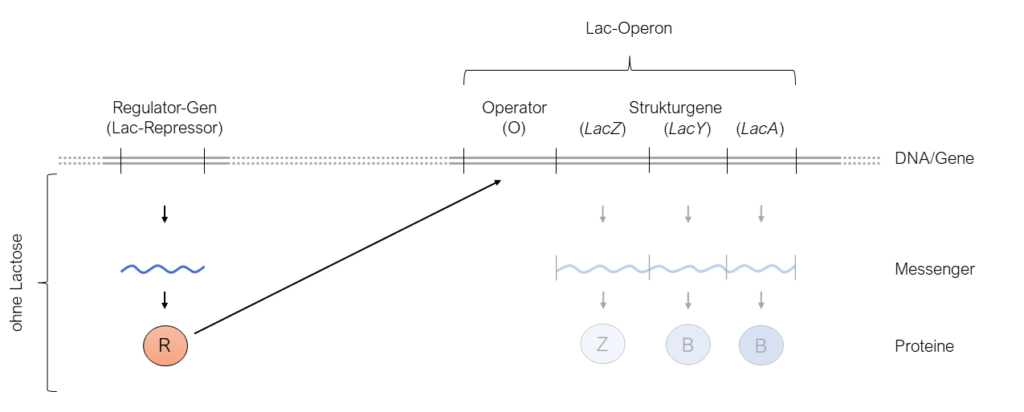 Nach dem Jacob-Monod-Modell kann die bakterielle DNA in verschiedene Bereiche unterteilt werden, so gibt es Gene, welche für Proteine kodieren, aber auch Bereiche, welche Regulatorische Zwecke dienen (siehe den bereits eingeführten „Operator“). Gene, welche für Proteine kodieren, die in Ihrer Funktion voneinander abhängig bzw. aufeinander angewiesen sind, liegen sehr nahe beieinander. Dies ermöglicht es dem Bakterium alle diese Gene gleichzeitig zu regulieren und so enorme Mengen an Energie gegenüber dem Fall einzusparen, wenn die Expression jedes Genes allein reguliert werden. Der DNA-Abschnitt, welcher den Operator sowie die zu regulierende Gene beinhaltet, wird unter dem Begriff „Operon“ zusammengefasst, der auch namensgebend für das Modell war (siehe oben). An anderer Stelle des Genoms befindet sich ein Gen, das für einen Protein kodiert, welches die Expression der Gene reguliert, die sich in einem Operon befinden. Das Protein wird dabei, je nachdem, ob es sich um einen Aktivator oder um einen Repressor handelt, durch die Anwesenheit eines Inducers aktiviert oder deaktiviert. Zu erwähnen ist zudem, dass jedes Regulierendes Protein, die Expression bestimmter Gene kontrolliert. Am vorherigen Beispiel der Lactose würde das bedeuten, dass der in diesem Zusammenhang entdeckte Regulator, welcher als Repressor identifiziert wurde und von nun an Lac-Repressor genannt wird (Lac steht für Lactose), spezifisch mit der Operator-Sequenz interagiert, welche die Expression der β-Galactosidase (LacZ) und β-Galactosid-Permease (LacY) reguliert. Später erkannten WissenschaftlerInnen, dass noch ein weiteres Gen zu dem Lac-Operon gehört: LacA. Dieses kodiert für das Protein β-Galactosid-Transacetylase. Der DNA-Abschnitt, welcher diesen Operator sowie die Gene für die β-Galactosidase (LacZ), β-Galactosid-Permease (LacY) und β-Galactosid-Transacetylase beinhaltet, wird Lac-Operon genannt. Nach Jacob & Monod, interagiert der Lac-Repressor mit der Operator-Sequenz in Abwesenheit der Lactose und verhindert so die Expression der dahinter folgenden Gene. In Anwesenheit der Lactose hingegen wird der Lac-Repressor in seiner Funktion inaktiviert und erlaubt es so, die Expression der darauffolgenden Gene.