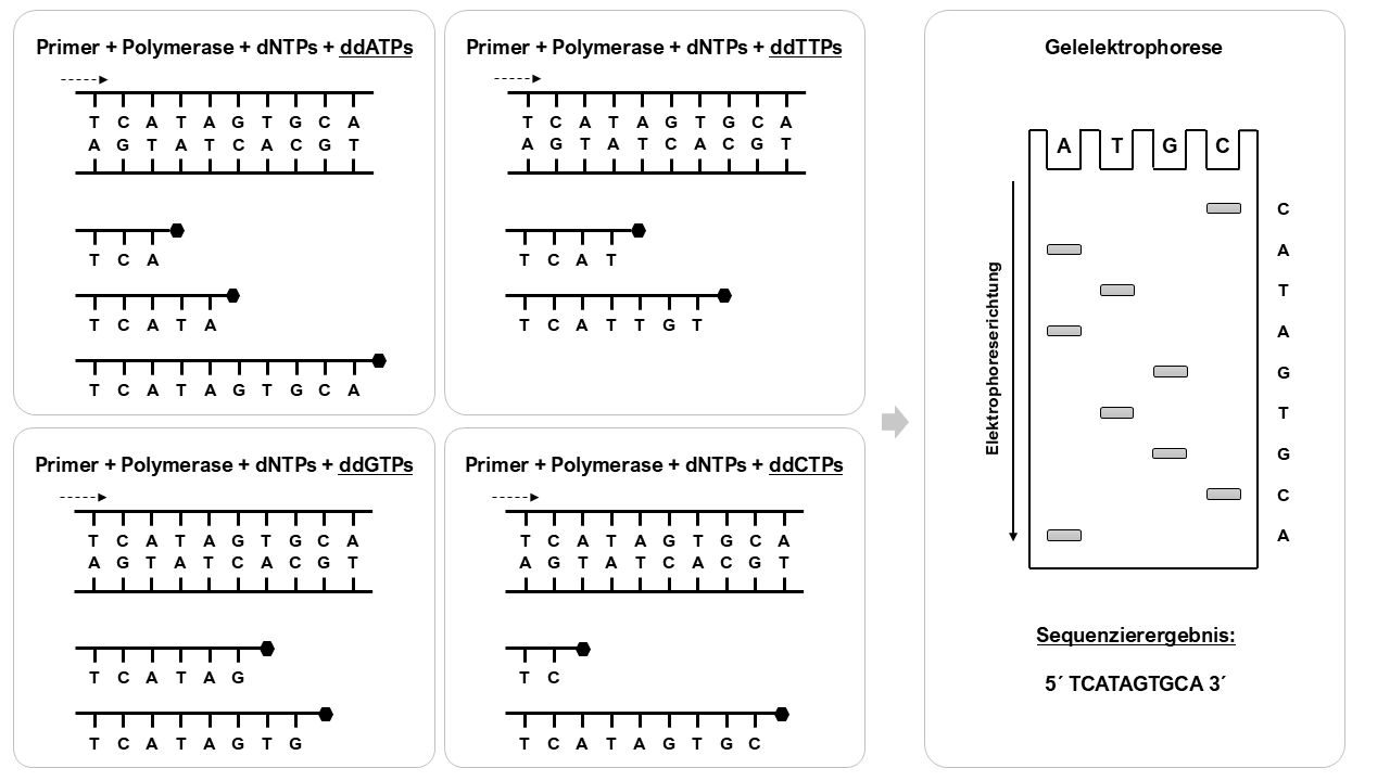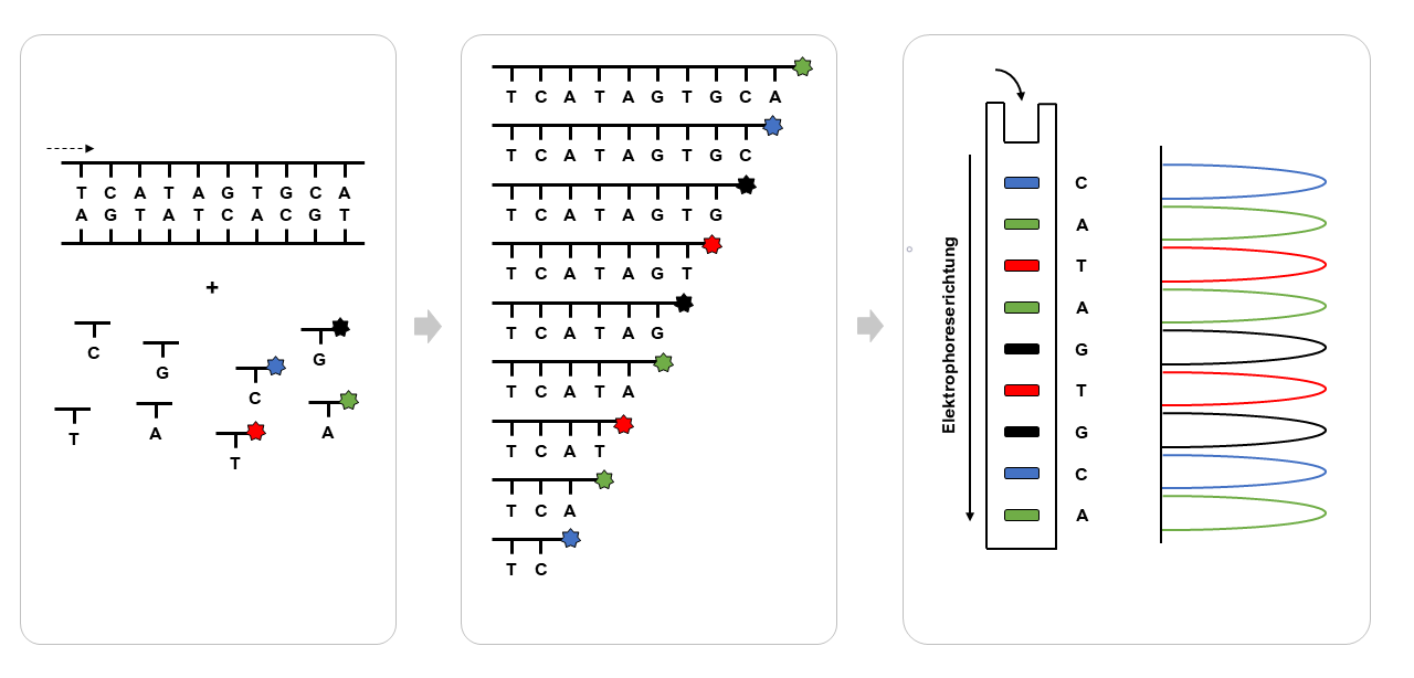 Schon 1977 gelang Sanger ein Durchbruch: die Dideoxy-Methode, besser bekannt als Sanger-Sequenzierung. Hierbei werden den Reaktionsansätzen spezielle Bausteine, die Dideoxynukleotide (ddNTPs), zugegeben. Diese besitzen keine 3’-OH-Gruppe. Sobald sie eingebaut werden, bricht die DNA-Synthese ab. Dadurch entstehen DNA-Fragmente unterschiedlicher Länge, die im Gel sauber getrennt werden können. Die Reihenfolge der Fragmente zeigt die DNA-Sequenz. Diese Methode war viel zuverlässiger und erlaubte erstmals die Sequenzierung langer DNA-Stücke.